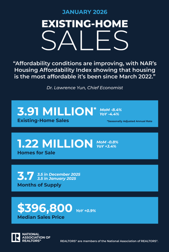 WASHINGTON (February 12, 2026) – Existing-home sales decreased by 8.4% in January, according to the National Association of REALTORS® Existing-Home Sales Report. The report provides the real estate ecosystem—including agents, homebuyers and sellers—with data on the level of home sales, price, and inventory.